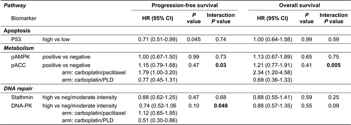 At multivariable analyses of putative predictive biomarkers (Table 2), the predictive value role was confirmed for pACC (for both PFS and OS) and for DNA-PK (only for PFS). In both cases the presence of the biomarker appears to reduce the effect of the carboplatin/paclitaxel combination (Figures 1 and 2).