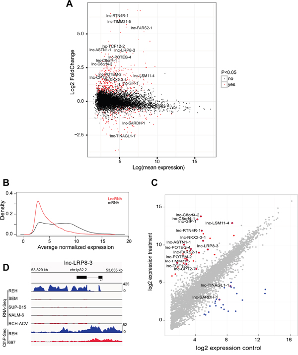 Figure 1: Specific lncRNA expression pattern in ETV6/RUNX1-driven BCP-ALL. A. MA-plots, which display the mean expression and fold change of differentially expressed lncRNAs in ETV6/RUNX1 driven leukemias (adjusted p-value < 0.05) identified by microarray expression profiling B. Density plot of average normalized expression values for lncRNAs and mRNA transcripts in 25 ETV6/RUNX1-positive BCP-ALLs C. Diagonal plot that represents differentially up-regulated (Red) and down-regulated (Blue) lncRNAs in an ETV6/RUNX1-positive BCP-ALL cell line identified by RNA-sequencing of 13 BCP-ALL cell lines (adjusted p-value < 0.05). D. RNA sequencing tracks that represent expression of lnc-LRP8-3 in five BCP-ALL cell lines and H3K27ac binding patterns (ChIP-Seq) of the same genomic locus in REH and 697 cells.