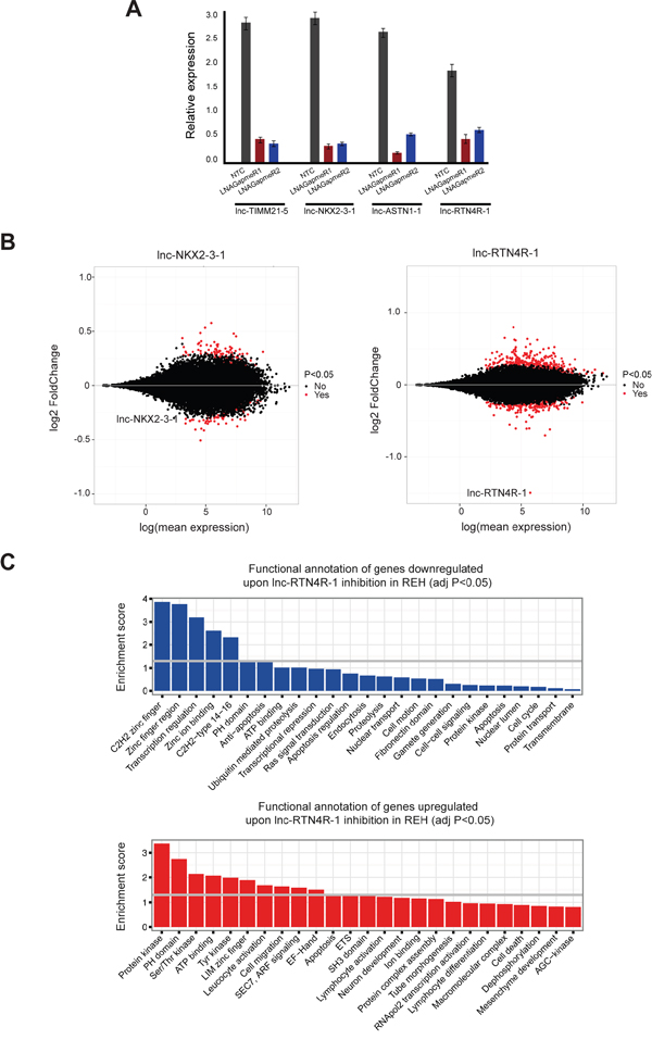 Figure 4: Transcriptional consequences of lncRNA modulation in the context of ETV6/RUNX1 rearranged leukemia cases. A. RT-qPCR analysis of lncRNA knockdown experiments using two independent LNA GapmeRs for each lncRNA. This plot is representative for three independent biological replicates and knockdown was evaluated with three different primer pairs for each lncRNA. B. MA-plots, which display the mean expression and fold change of RNA sequencing data of REH cells upon lnc-NKX2-3-1 and lnc-RTN4R-1 knockdown. Significantly differentially expressed genes are represented in red. C. Functional annotation of genes down- and up-regulated upon lnc-RTN4R-1 knockdown in REH cell line.