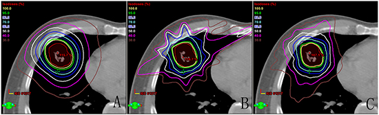 Figure 1: Comparison of dose distribution for each of the three techniques: A. dynamic conformal arc therapy, B. intensity modulated radiation therapy, C. double partial arcs Rapidarc.
