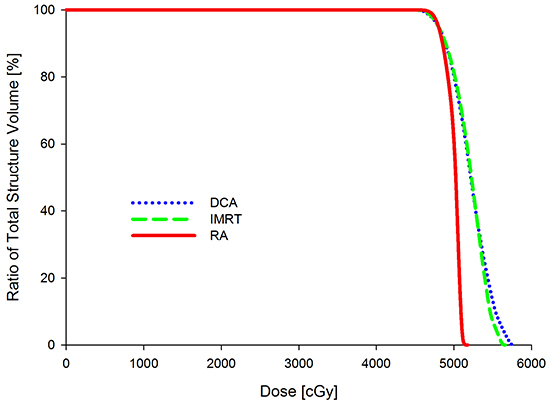Figure 2 shows the DVH for the PTV with the DCA, IMRT and RA plans. Comparisons of the treatment planning techniques for the PTV were summarized in Table 1. Between DCA and IMRT, no statistical difference was observed in terms of D98%, D50%, D2%, V90%, V95% and V105%. Similar to DCA and IMRT, between IMRT and RA, statistical significant results were not observed. There was a significant difference between DCA and RA for D2% (p<0.001). RA displayed a slightly better PTV coverage than DCA.