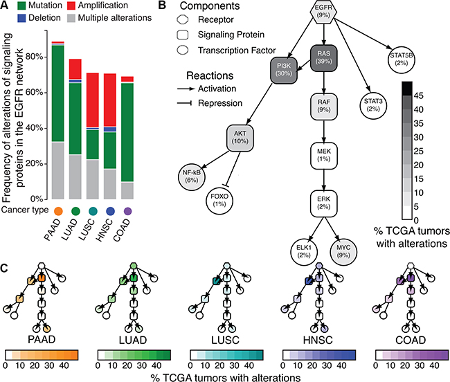 Figure 1: Frequency of DNA alterations to EGFR network signaling proteins in TCGA. A. Summary of total number of mutations or copy number alterations in the network for pancreatic adenocarcinoma (PAAD), lung adenocarcinoma (LUAD), lung squamous cell carcinoma (LUSC), head and neck squamous cell carcinoma (HNSCC), and colon adenocarcinoma (COAD) tumors in TCGA. B. Cell signaling network of EGFR in human tumors. Shading of each node indicates the percentage of samples with alterations in each node of the EGFR cell signaling network across all the TCGA tumor types in A according to the color bar. C. Cell signaling network of EGFR, with nodes shaded according to percentage of samples with DNA alterations in each tumor type from A.