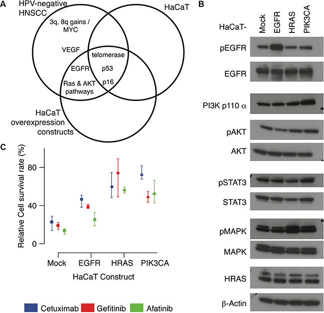 Figure 2: HaCaT overexpression constructs. A. Venn diagram comparing molecular alterations in HPV-negative HNSCC to the HaCaT keratinocyte cell lines and HaCaT-EGFR, HaCaT-HRASV12D, and HaCaT-PIK3CAH1047R overexpression constructs. B. Western blots for each HaCaT cell line. C. Total colony area (survival rates) for each HaCaT construct after seven days of treatment with cetuximab (100nM, blue), gefitinib (100nM, red) and afatinib (10nM, green) relative to PBS control, set at 100% of survival. Mean values are indicated as points and error bars represent the maximum and minimum values over three replicates.