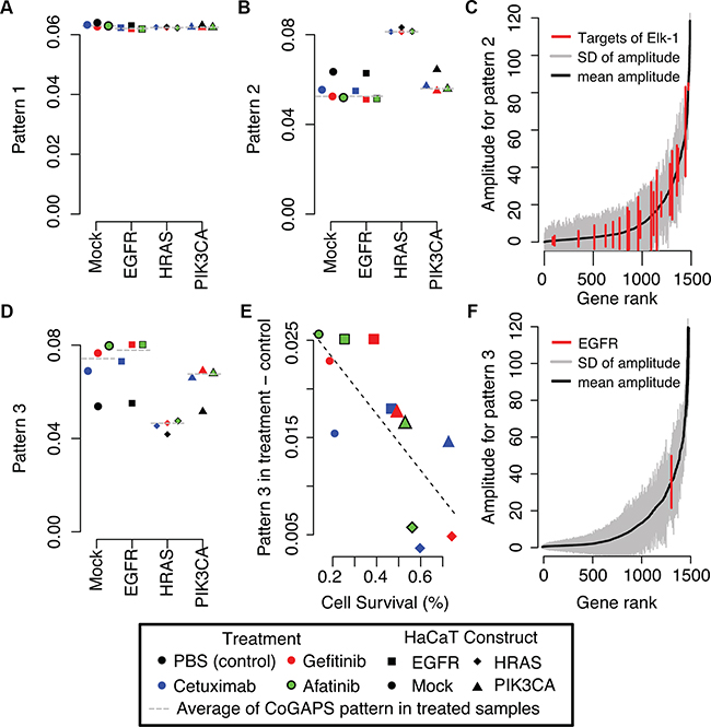 Figure 3: CoGAPS meta-pathways and activity patterns in HaCaT constructs. A. First CoGAPS pattern capturing genes with limited expression changes in HaCaT constructs or treatment with EGFR inhibitors. B. Second CoGAPS pattern with increased gene expression in HaCaT-HRASV12D samples and decreased gene expression in samples that were treated with EGFR inhibitors. C. Magnitude of the corresponding gene associations (amplitude) in all genes (grey) for pattern 2 relative to genes that are targets of transcription factor Elk-1 (red) that is activated by the MAPK pathway. D. Third CoGAPS pattern with decreased gene expression in HaCaT-HRASV12D samples and increased gene expression in samples that were treated with EGFR inhibitors. In A, B, and D, each pattern CoGAPS has a magnitude that is scaled to sum to one across all samples. As a result, samples with pattern values close to zero are unassociated with the given gene signature. On the other hand, samples with pattern values close to one are more strongly associated with the gene signature than any other sample in the data. Values in between one and zero quantify the relative gene expression changes among the genetic backgrounds and treatments. E. Comparison of the difference in the magnitude of the third CoGAPS pattern in samples treated with EGFR inhibitors relative to untreated samples to relative cell survival rates after treatment with EGFR inhibitors in each HaCaT construct. F. Magnitude of the corresponding gene associations (amplitude) in all genes (grey) for pattern 3 relative to EGFR (red).