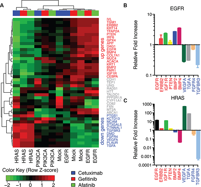 Because AP-2alpha is a transcription factor, its mRNA or protein expression may not directly correlate with its change in activity resulting from EGFR inhibition. Therefore, to confirm AP-2alpha mediated feedback, we measure gene expression of AP-2alpha target genes associated with growth factor receptor signaling which increased (EGFR, ERBB2, IGF1R, PTEN, BMP2, BMP4) or decreased (VEGFA, TGFA, FGFR4, TGFBR3) after EGFR inhibition in sensitive cells (HaCaT-EGFR and HaCaT-Mock). Because afatinib treatment has the strongest effect on gene expression, RT-PCR validation of the microarray data is performed only for these samples. Accordingly, RT-PCR analysis confirms consistent gene expression changes after afatinib treatment in all validated genes, excluding EGFR in HaCaT-EGFR, a transcript artificially sustained with an exogenous promoter (Figure 4B). This signature is also disrupted after afatinib treatment in HaCaT-HRASV12D cells (Figure 4C). In this case, expression changes in BMP2, BMP4, VEGFA, and TGFA are observed to be in the opposite direction from HaCaT-EGFR after treatment, consistent with the heatmap of AP-2alpha targets in Figure 4A. Also consistent with the clustering analysis, RT-PCR demonstrates modest gene expression changes in HaCaT-Mock (Supplementary Figure S7B) and consistent changes in HaCaT-PIK3CAH1047R (Supplementary Figure S7C) in these target genes after afatinib treatment. In both cases, the gene expression of “down” genes decreased after afatinib treatment similarly to HaCaT-EGFR and in contrast to HaCaT-HRASV12D.