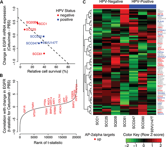 Figure 5: AP-2alpha gene expression signature in HNSCC cell lines. A. Change in EGFR expression after cetuximab treatment relative to PBS control in a panel of HPV-positive (blue) and HPV-negative (red) HNSCC cell lines. B. Relative ranking of “up” genes in the AP-2alpha gene expression signature among correlation statistics for changes in gene expression after cetuximab treatment in each gene with the changes in EGFR expression. C. Heatmap of difference in gene expression between cetuximab treated and untreated HNSCC cells in each AP-2alpha target genes. HNSCC cell lines are ordered according to HPV-status (negative, red and then positive, blue) and then relative cell survival after cetuximab treatment.