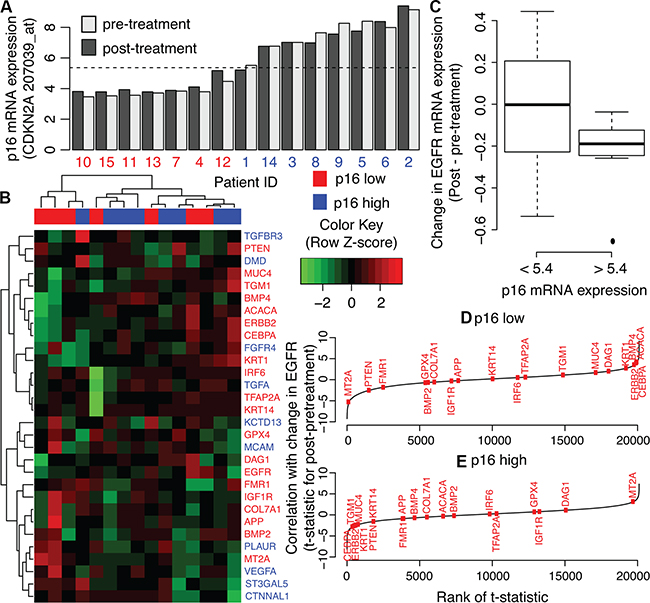 Figure 6: AP-2alpha gene expression signature in human HNSCC pre and post cetuximab treatment biopsies. A. CDKN2A expression in pre- (light grey) and post-treatment (dark grey) biopsies. Values are compared to average CDKN2A expression in all samples (dashed-line). This average expression is used as a threshold to label samples as having low (red) or high (blue) CDKN2A expression, labeled p16 low and high, respectively. B. Heatmap of gene expression changes pre- and post-cetuximab treatment in genes in the AP-2 alpha signature. C. Relative ranking of “up” genes in the AP-2alpha gene expression signature among correlation statistics for changes in gene expression after cetuximab treatment in each gene with the changes in EGFR expression in tumors with low CDKN2A expression. D. As for C for tumors with high CDKN2A expression.