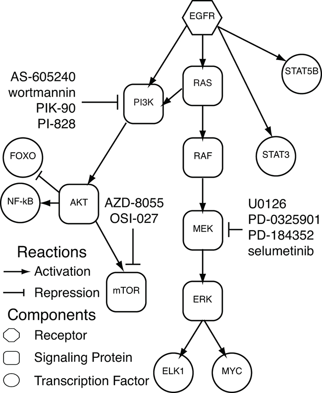 Figure 7: Significantly enriched therapeutic inhibitors in LINCS. EGFR cell signaling network including pertubagens from LINCS that inhibit signaling nodes in the EGFR network and are significantly associated with the AP-2alpha gene expression signature.