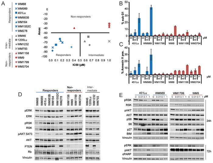 We next selected two responder cell lines, with particularly high Amax and low IC50 and two non-responder cell lines with low Amax and high IC50 to assess the effects of SCH984 on key effectors of the BRAF/MEK/ERK pathway in a time and concentration dependent manner (Figure 1E). SCH984 inhibited the phosphorylation of the ERK effector p90 ribosomal S6 kinase (pRSK) in both responder and non-responder cells; although pRSK baseline levels were lower in the non-responder group. Further, SCH984 inhibited the phosphorylation of the ribosomal protein S6 in the two responder cell lines and one of the non-responder cell lines (WM9), whereas S6 remained phosphorylated in the other non-responder cell line (WM1799). ERK inhibition led to up-regulation of the CDK inhibitor p27KIP1 in both subgroups. Additionally, AKT was phosphorylated in the non-responder subgroup, whereas pAKT levels were relatively low in the responder cells. The pro-apoptotic factor BIM was induced in both subgroups, albeit at lower levels in the non-responder cells. Finally, we detected PARP cleavage and increased apoptosis in responder cells but not in the non-responder cell lines after 72h of treatment with 1 μM of SCH984.