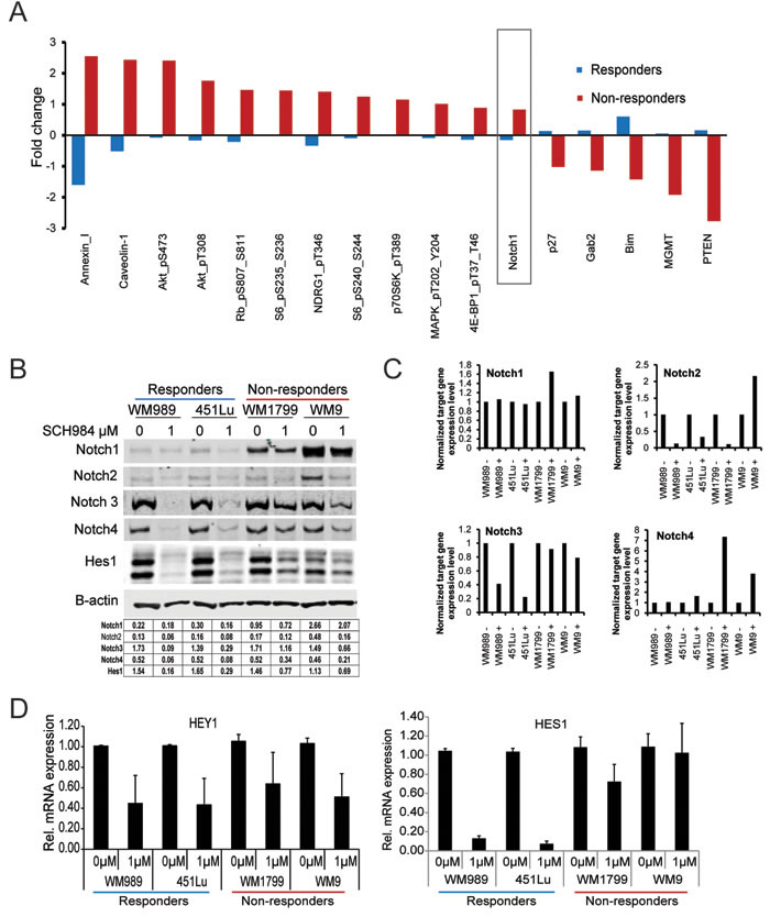 Figure 2: PI3K and Notch signaling are enhanced in SCH984 non-responders. A. Two responder (451Lu, WM989) and 2 non-responder (WM9, WM1799) melanoma cell lines were treated with 1μM SCH984 for 72h. Total protein lysates were analyzed by reverse phase protein array (RPPA). Proteins with the highest deviation from the global median are shown; mean of three biological replicates. B. Two responder and 2 non-responder cell lines were treated with DMSO control or SCH984 1uM for 72h. Immunoblot analysis for Notch1, 2, 3, 4, and Hes1; B-actin was used as loading control. Band intensity was quantified relative to area and B-actin; quantification is shown in table. C. mRNA expression levels of Notch1, 2, 3, and 4 normalized to GAPDH. Relative change between untreated and treated with SCH984 1uM. D. HES1 and HEY1 mRNA levels were assessed by QRT-PCR in 2 responder and 2 non-responder cell lines.