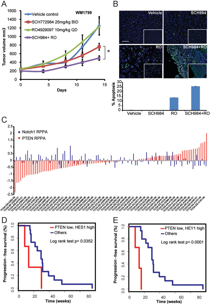 Figure 4: PTEN low and Notch high melanoma patients respond poorer to MAPK inhibitors. A. The SCH984 non-responder cell line WM1799 was established as xenografts in vivo. Mice were randomized into four groups and treated as indicated. The difference in growth rate between SCH984 monotherapy and the combination of SCH984 with RO was statistically significant (p = 0.001). B. TUNEL staining of representative tumors from vehicle, SCH984, RO, and combination-treated groups harvested 4 hours post last dosing. Images were pseudo-colored to indicate apoptotic cells; original images are shown in the inserts. C. RPPA analysis of the TCGA melanoma data for PTEN and Notch1 levels in the BRAF-V600E mutant cohort (n = 104). Deviation from the global median is shown. PTEN and Notch1 levels were inversely correlated (Spearman’s r = -0.2871, p = 0.0031). D.-E. Progression free survival in a set of 21 BRAF-V600E mutant melanoma patients treated with BRAF inhibitors determined by RECIST criteria [43] for patients in clinical trials or by objective response as determined by the treating physician for patients not in clinical trials. Patients with low PTEN/ high Hes1 (p = 0.0352) or low PTEN/high Hey1 (p < 0.0001) have significant shorter progression-free survival than other patients.