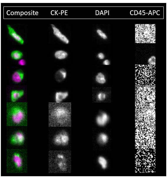 Figure 1: Patient CTCs detected by the CellSearch® system. The second row shows a nucleated, CD45 positive cell below the CTC which is a leukocyte below the patient CTC. The varying morphology of patient CTCs is evident from Figure 1 where some CTCs appear epithelial like in morphology whereas some appear fibroblast-like and mesenchymal. Imaged on the Celltracks Analyzer II ® system.
