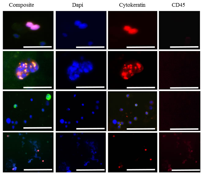 Figure 3: Presentation of selected CTCs in the peripheral blood of HNC patients. Image gallery presenting CTCs captured by the RosetteSep™ system: Cytokeratin, EGFR, DAPI-positive but CD45 negative. Imaged on the Olympus IX3 inverted microscope. Scale bars represent 50 µm.