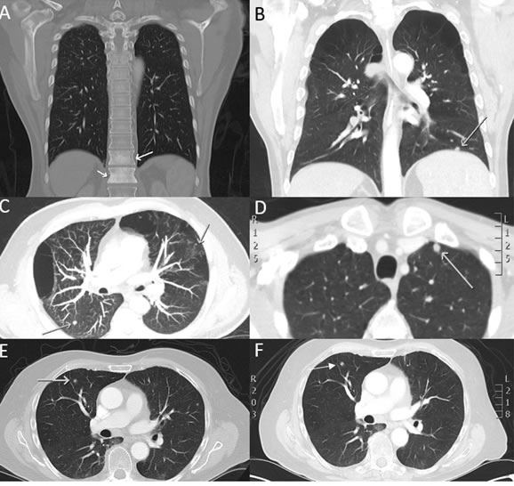 Figure 4: CT scan images of selected HNC patients presenting with suspicious HNC metastasis. Bloods were taken upon presentation of these patients to clinic and CTCs assessed. Patient presenting with A. bony metastasis B., C., D. multiple suspicious lung metastasis E., F. lung nodule which increased in size over 37 days.