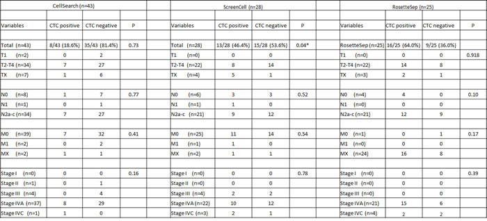 Table 2: Correlation between tumour stage and CTC presence across the CellSearch®, ScreenCell® and RosetteSep™ platforms.