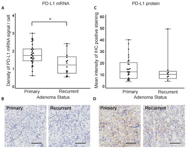 Figure 3: PD-L1 mRNA and protein expression in primary and recurrent pituitary tumors. A. Quantification of PD-L1 RNAscope staining in primary (n = 34) and recurrent (n = 14) pituitary adenomas. B. RNAscope staining of PD-L1 mRNA in a primary and a recurrent pituitary tumor. C. Quantification of PD-L1 IHC staining in primary and recurrent pituitary adenomas. D. IHC staining of PD-L1 protein in a primary and a recurrent pituitary adenoma. *p < 0.05, scale bar 50 µm.