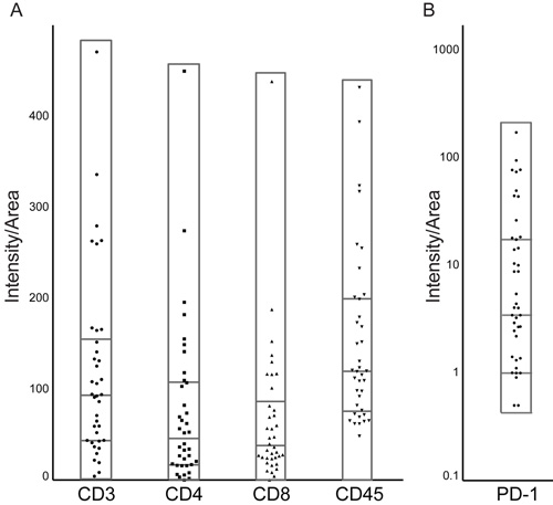 Figure 6: Immune infiltrate markers and PD-1 expression across pituitary adenomas. Pituitary tumors express variable levels of A. lymphocytic markers, including the T-lymphocyte markers CD3, CD4, and CD8, as well as the pan-lymphocyte marker CD45, and B. PD-1. Protein expression is normalized to intensity/cell surface area. Samples within each scatter plot are divided into quartiles, centered around the median.