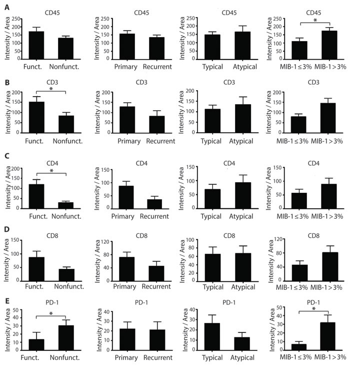 Figure 7: Characterization of the immune infiltrate of pituitary tumors in tissue specimens. A. Pan-lymphocyte marker CD45 expression in pituitary tumors classified according to tumor function, recurrence status, aggressiveness level, or proliferation status. B. CD3+ T lymphocyte, C. CD4+ T lymphocyte, D. CD8+ T lymphocyte and E. PD-1 expression in pituitary tumors. *p < 0.05.