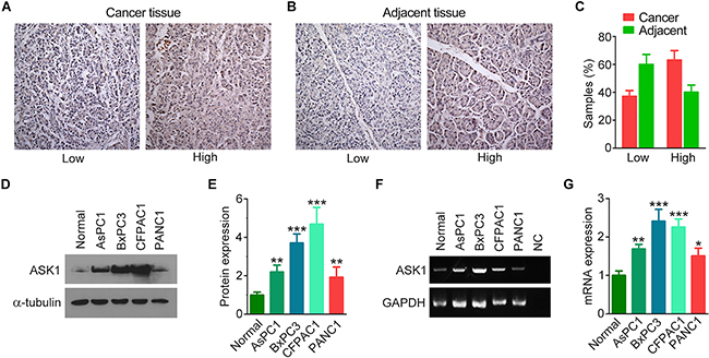 Figure 1: ASK1 is overexpressed in pancreatic cancer. A, B. Representative images showing immunohistochemical staining of ASK1 expression in pancreatic cancer tissues (A) and adjacent tissues (B). C. Quantification of ASK1 expression in pancreatic cancer tissues (n = 19) and adjacent tissues (n = 10). D, E. Western blot analysis (D) and quantification (E) of ASK1 expression in normal pancreatic epithelial cells and pancreatic cancer cell lines. Experiments were repeated 3 times. F, G. RT-PCR analysis (F) and quantification (G) of ASK1 mRNA expression in normal pancreatic epithelial cells and pancreatic cancer cell lines. NC, negative control (i.e., without RNA). Experiments were repeated 3 times. Error bars represent mean ± SEM. *p < 0.05; **p < 0.01; ***p < 0.001.