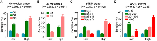 Figure 2: Correlation of ASK1 expression with clinicopathological variables of pancreatic cancer. ASK1 expression was examined by immunohistochemical staining as shown in Figure 1. The correlation between ASK1 expression and histological grade A. lymph node (LN) metastasis B. pathological tumor node metastasis (pTNM) stage C. and carbohydrate antigen 19-9 (CA19-9) level D. was analyzed by the Spearman’s rank correlation test (n = 19). The correlation coefficient (r) and p values were then calculated. Error bars represent mean ± SEM.