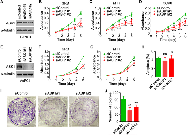To gain mechanistic insight into the role of ASK1 in pancreatic cancer, we used ASK1-targeted siRNAs to knock down the expression of ASK1 in PANC1 cells (Figure 3A). We then analyzed the effect of ASK1 siRNAs on cell proliferation using sulforhodamine B (SRB) staining assay. As shown in Figure 3B, PANC1 cells treated with ASK1-targeted siRNAs proliferated more slowly than control cells. Similar results were obtained using 3-(4,5-dimethylthiazol-2-yl)-2,5-diphenyltetrazolium bromide (MTT) and cell counting kit-8 (CCK8) assays (Figure 3C, 3D). By SRB and MTT assays, we also found that siRNA-mediated knockdown of ASK1 expression significantly inhibited the proliferation of AsPC1 pancreatic cancer cells (Figure 3E-3G). By contrast, ASK1 siRNAs did not significantly affect the proliferation of normal pancreatic epithelial cells (Supplementary Figure S1). These results suggest that ASK1 is important for pancreatic cancer cell proliferation and that this effect is specific to malignant cells.