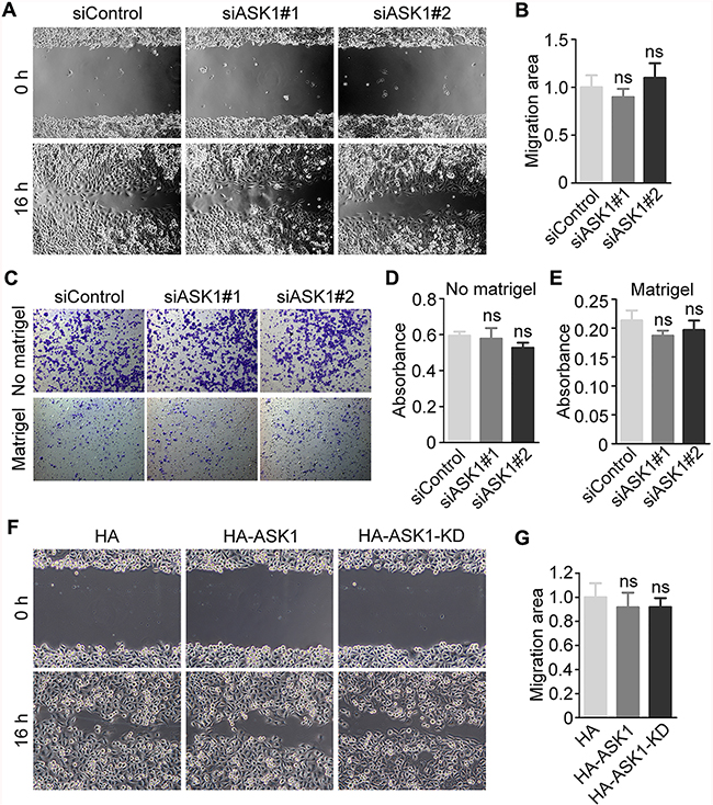 Figure 5: Effect of ASK1 on the motility of pancreatic cancer cells. A. PANC1 cells were transfected with the indicated siRNAs, and cell migration was examined by wound healing assays. B. Quantification of (A). The relative migration area at 16 hours after scratch creation was measured. C. Transwell assays were performed using PANC1 cells transfected with control or ASK1 siRNAs in the absence or presence of matrigel on the upper surface of the transwell filters. D, E. Migratory (D) and invasive (E) abilities of pancreatic cancer cells were quantified based on experiments shown in the upper and lower panels, respectively in (C). F, G. PANC1 cells were transfected with plasmids expressing HA, HA-ASK1, or HA-ASK1-KD, and cell migration was analyzed using wound healing assays. Error bars represent mean ± SEM. ns, not significant.