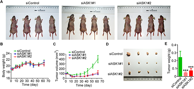Figure 6: ASK1 promotes pancreatic tumorigenesis in mice. A. Representative images of nude mice bearing tumors derived from PANC1 cells pretreated with the indicated siRNAs. B, C. Body weight (B) and tumor volume (C) were measured over a two-month period. D, E. After mice were sacrificed, tumors were dissected and photographed (D), and tumor mass was measured (E). Error bars represent mean ± SEM. ***p < 0.001.