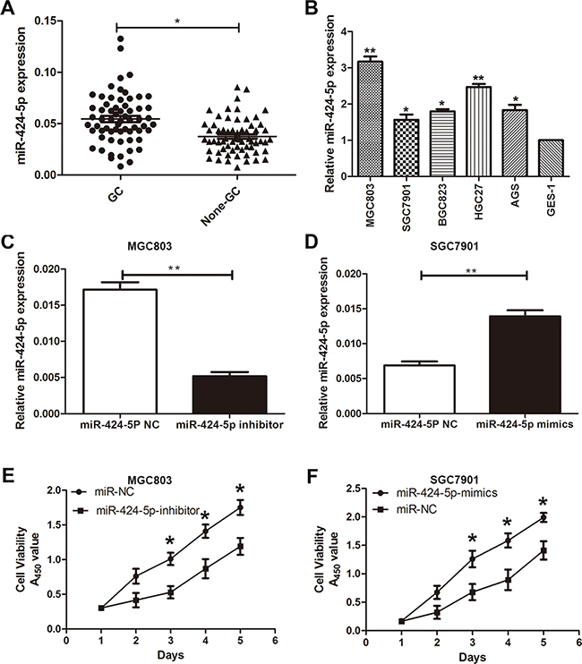 Figure 1: MiR-424-5p was up-regulated in GC tissues and cells. A. The expression levels of miR-424-5p in 63 pairs of human GC tissues and adjacent normal tissues by qRT-PCR. B. The expression levels of miR-424-5p in GC cells and GES-1. C. and D. miR-424-5p expression in cells transfected with miR-424-5p inhibitor and miR-424-5p mimics lentivirus. E. and F. Cells transfected with miR-424-5p inhibitor and miR-424-5p mimics lentivirus were determined using a CCK8 assay.