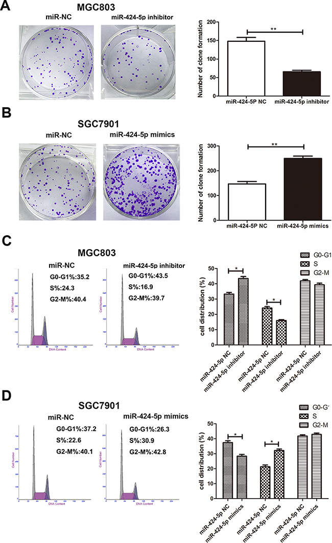 Figure 2: Effects of miR-424-5p expression on GC cell proliferation. A. and B. The colony formation results of cells transfected with miR-424-5p inhibitor and miR-424-5p mimics lentivirus. C. and D. The effects of miR-424-5 inhibitor or mimics on cell cycle distribution of GC cells.