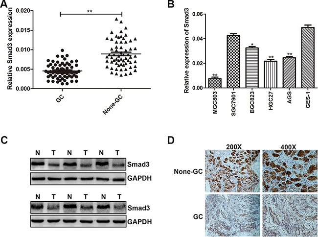 Figure 3: Smad3 was down-regulated in GC tissues and cells. A. The expression level of Smad3 was determined in 63 pairs of human GC tissues and adjacent normal tissues by qRT-PCR. B. The expression level of Smad3 in GC cells and GES-1. C. Smad3 protein level was examined by western blotting in six paired of GC tissues. D. Smad3 protein level in GC specimens and adjacent normal tissues was determined by immunohistochemistry staining.