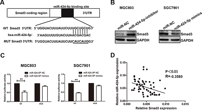 Figure 4: Smad3 was a direct target of miR-424-5p. A. The potential miR-424-5p binding site at the 3’-UTR of Smad3 mRNA was computationally predicted by Tragetscan. B. Smad3 protein level in GC cells transfected with miR-424-5p inhibitor lentivirus and miR-424-5p mimics lentivirus. C. Luciferase activity was analyzed in cells co-transfcted with miR-424-5p mimics or negative control with pGL3-Smad3 or pGL3-Smad3-mut. D. A negative correlation between the expression levels of miR-424-5p and Smad3 in GC specimens (P<0.05).