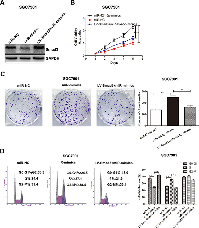 Over-expression of Smad3 could partially reverse the effects of miR-424-5p on GC cell proliferation