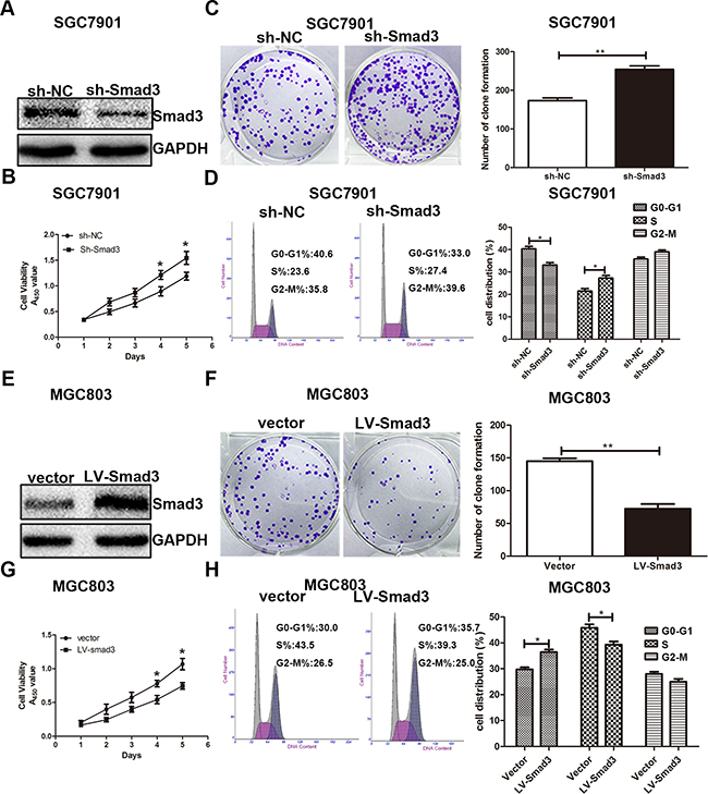 Figure 6: Effects of Smad3 expression on GC cell proliferation. A. the Smad3 expression in cells transfected with Smad3 inbibitor. B, C. and D. Cells transfected with Smad3 inhibitor were determined using CCK8 assay, plate clone assay and cell cycle assay. E. the Smad3 expression in cells transfected with Smad3 lentivirus. F, G. and H. CCK8 assay, plate clone assay and cell cycle assay were used to determine the effects of over-expression Smad3 in GC cell proliferation.