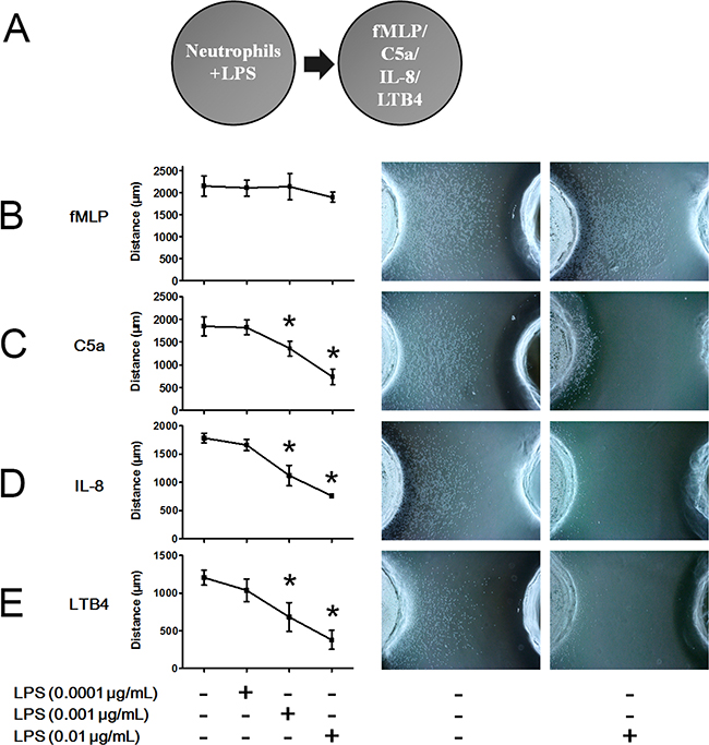 Figure 2: FMLP-induced chemotaxis is less sensitive to LPS treatment than other chemoattractants. A. The under agarose chemotaxis assay was set as shown. The neutrophil suspension in the presence or absence of LPS was placed in the left well. Treatments of 0.01 μmol/L fMLP, 1 μmol/L C5a, 1 μmol/L IL-8 or 0.1 μmol/L LTB4 were placed in the right well. B. LPS did not significantly inhibit fMLP-induced neutrophil chemotaxis. C-E. Neutrophil chemotaxis distances of C5a, IL-8 and LTB4 were markedly inhibited by 0.001 and 0.01 μg/mL LPS stimulation. Representative neutrophil chemotaxis photos are shown. The data were expressed as the mean ± SD, n=5 for each group. *P < 0.05 compared with the control group.