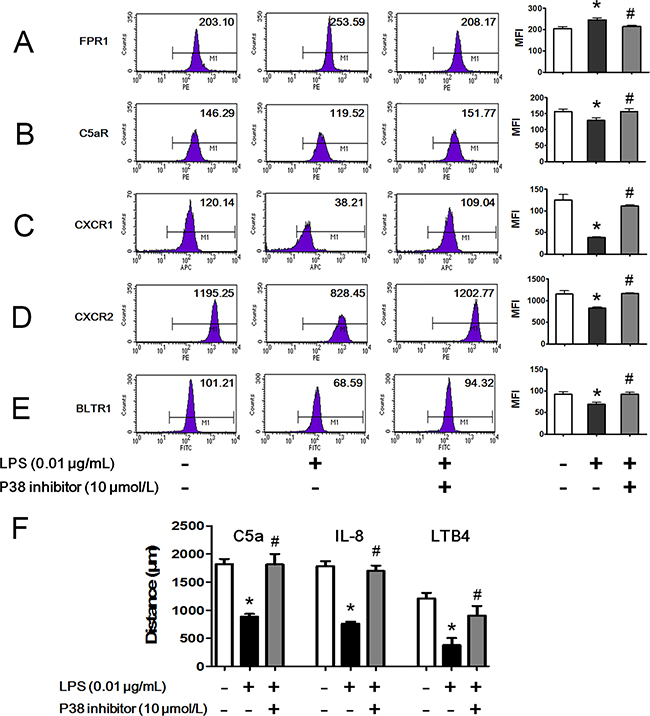 Figure 5: Bidirectional regulation of LPS on chemoattractant receptors via p38 MAPK. Neutrophils were stimulated with 0.01 μg/mL LPS for 45 min in the presence or absence of 10 μmol/L p38 inhibitor. A. Membrane chemoattractant receptors were detected by FCM. Expression of membrane receptor of fMLP, FPR1, was increased by LPS stimulation. p38 inhibitor restored the increment. B-E. Expressions of membrane receptors of C5a (C5aR), IL-8 (CXCR1, CXCR2) and LTB4 (BLTR1) were decreased by LPS stimulation. p38 inhibitor restored the decrements. F. LPS inhibited neutrophil chemotaxis toward C5a, IL-8 and LTB4. In the presence of p38 inhibitor, the inhibitory effect of LPS was weakened. The data were expressed as the mean ± SD, n=5 for each group. *P < 0.05 compared to the control group, #P < 0.05 compared to the LPS group.