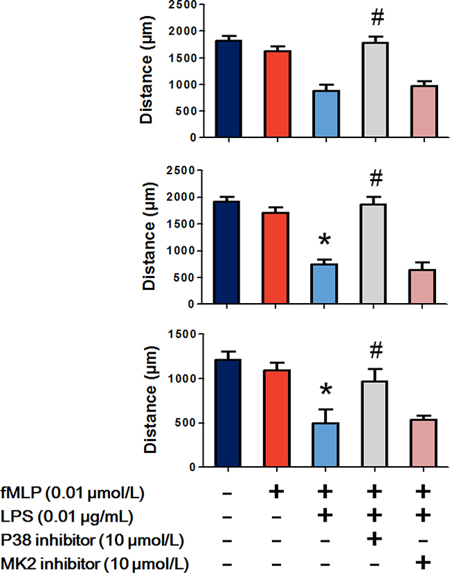 Figure 7: p38 participates in LPS improved hierarchical neutrophil chemotaxis. The results of the under agarose chemotaxis assay showed that fMLP 0.01 μmol/L treatment slightly but not significantly decreased C5a-, IL-8- and LTB4-induced neutrophil chemotaxis. LPS 0.01 μg/mL significantly enhanced the inhibitory effect of fMLP, which was then reverted by the p38 inhibitor but not the MK2 inhibitor. The data are expressed as the mean ± SD, n=5 for each group. *P < 0.05 compared to the control group, #P < 0.05 compared with the fMLP+LPS group.