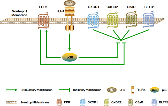 Bidirectional regulation of LPS on chemoattractant receptors via p38 MAPK