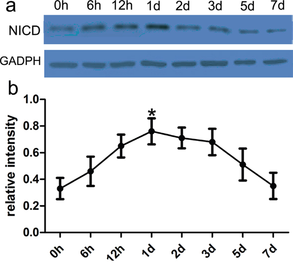 Figure 2: Notch-1 activity was highly altered in rat ICH model. In the present study, western blot analysis of Notch-1 activity in ipsilateral basal ganglia adjacent to the hematoma was performed at different time points following ICH. a. The immune complex was subjected to immunoblot analysis with NICD antibody. GAPDH was used as a loading control. b. Quantification analysis showed the increased Notch-1 activity after ICH. Results shown are the mean ± SEM of repeated independent experiments. *p<0.01, compared with control, one-way ANOVA.