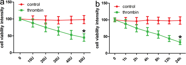 Figure 3: CCK-8 assays identifies that thrombin induces ICH cell models. a. Thrombin (40U/ml) reduced neuronal viability in a dose-dependent manner at post-treatment 24 h. b. Thrombin (40U/ml) reduced neuronal viability in a time-dependent manner. Results shown are the mean ± SEM of repeated independent experiments. *p<0.001, vs control; one-way ANOVA was used.