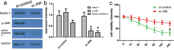 To elucidate the significance of JNK in Notch-1-JNK-induced neuronal injury when ICH occurred, we used specific JNK siRNAs to block the expression of JNK, and then observed Notch-1 activity and the relevant proteins in thrombin-induced neuronal cell model. Western blot analysis revealed that the knockdown of JNK affected Notch-1 pathway in thrombin-induced neuronal cell models compared with control siRNA. Subsequently, downregulated p-JNK activity also repressed the expression of active caspase-3 (Figure 7a, 7b). Based on the CCK-8 assay, the knockdown of JNK can reverse reduction of neuron cell viability caused by thrombin (Figure 7c). These findings indicated Notch-1-JNK pathway could contribute to thrombin-induced neuronal injury.