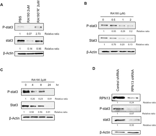 Figure 1: Impact of RA190 treatment or RPN13 knock down on P-Stat3 and Stat3 levels in MDSCs in vitro. (A) Immunoblot of P-Stat3 and Stat3 expression level of MDSCs treated with PBS, RA190 (2 μM), and the inactive analog RA190R (2 μM). (B) Expression of P-Stat3 and Stat3 in MDSCs treated with various doses of RA190 for 8 hours. (C) Time course of P-Stat3 and Stat3 expression in MDSCs following RA190 treatment. (D) Lentivirus expressing Rpn13 shRNA was used to infect MDSCs and knock down Rpn13 expression. Immunoblot showing Rpn13 protein expression in MDSCs treated with control shRNA and Rpn13 shRNA as well as expression level of P-Stat3 and Stat3.