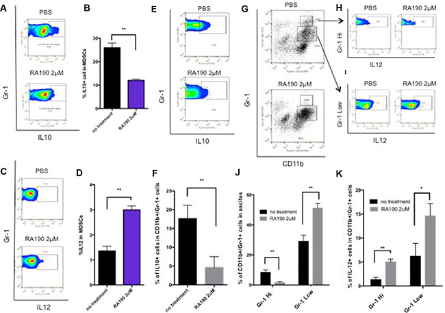 The cytokine expression profile of MDSCs from ascites collected from the peritoneum of ID8-Luc tumor bearing mice was also examined in the same manner. The ascites cells were treated with 2 μM RA190 for 8 hours and then analyzed by flow cytometry, with gating for CD11b+/GR1+ MDSC cell markers and intracellular staining with anti-IL10 (Figure 2E–2F) or IL12 antibody (Figure 2G–2I). The results obtained for MDSC in the ascites of mice bearing the intra peritoneal ID8-Luc tumor were similar to the cytokine data for MDSC from the spleen. The IL-10 expression level was 3 times higher in untreated MDSCs compared to RA190-treated cells (Figure 2E–2F), whereas IL-12 levels were enhanced by RA190 treatment. Interestingly, a shift in the MDSC population was also observed (Figure 2G–2I). In untreated ascites, about 7% of MDSCs displayed a Gr-1high (G-MDSC) phenotype. However, RA190 treatment caused the majority of MDSCs in ascites to shift to a Gr-1low phenotype (M-MDSC) (Figure 2G). An increase in IL-12 secretion in both MDSC phenotypes was also noted following RA190 treatment (Figure 2H–2K). These results suggest that RA190 treatment is able to both reduce suppressive IL-10 levels and concomitantly increase IL-12 production by MDSCs, which may impact their phenotype and immunosuppressive properties.