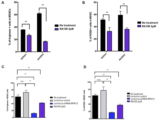 Figure 3: Arginase and iNOS levels in MDSCs isolated from spleen and tumor microenvironment following RA190 treatment or RPN13 knock down in vitro. (A and B) MDSCs from spleens and ascites of ID8-Luc tumor-bearing mice were treated with or without RA190 (2 μM) in vitro for 24 hours. The levels of Arginase and iNOS were assessed by flow cytometry. (A) Bar graph showing arginase expression in CD11b+Gr1+ cells isolated from spleen and ascites. (B) Bar graph showing iNOS expression in CD11b+Gr1+ cells isolation from spleen and ascites. (C and D) Lentivirus expressing Rpn13 shRNA was used to infect MDSCs and knock down Rpn13 expression. Arginase and iNOS expression in MDSCs receiving no treatment, infected with lentivirus expressing control shRNA, infected with lentivirus expressing Rpn13 shRNA, or treated with RA190 (2 μM) were assessed by flow cytometry. (C) Bar graph showing the percentage of arginase expressing CD11b+Gr-1+ cells in different groups. (D) Bar graph showing the percentage of iNOS expressing CD11b+Gr-1+ cells in different groups. Values are shown as mean ± SD (*P = 0.05, **P = 0.01, ns, not significant).