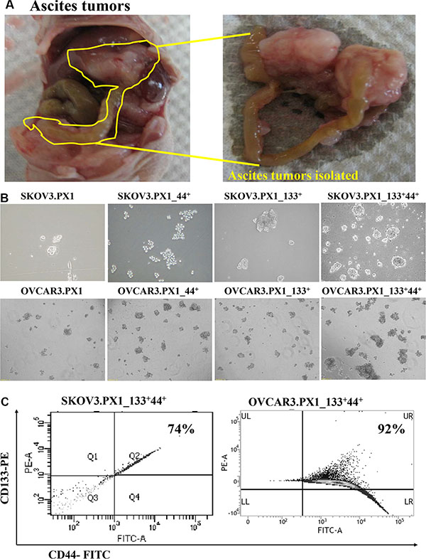 Figure 1: SKOV3 and OVCAR3 cells from tumor ascites and SKOV3.PX1_133+44+ and OVCAR3.PX1_133+44+ cells exhibit characteristics of malignant tumor progenitor cells. (A) SKOV3 and OVCAR3 ascites tumors. SKOV3 and OVCAR3 cells were injected intraperitoneally into nude mice, yielding abdominal ascites and peritoneal tumor formation. Most tumors grew on the pancreas and mesentery. (B) CD133+/CD44+ ascites cells exhibited increased sphere formation. Four cell subsets were grown in sphere formation cultures with CSC media in ultra-low-attachment dishes. Cells were photographed at 100× magnification. (C) CD133+ and CD44+ expression in SKOV3.PX1_133+44+ and OVCAR3.PX1_133+44+ cells.