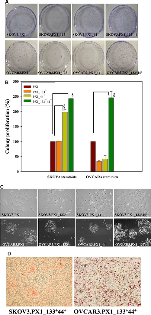 Figure 2: Stemness characteristics of SKOV3.PX1_133+44+ and OVCAR3.PX1_133+44+ cells. (A) SKOV3.PX1_133+44+ and OVCAR3.PX1_133+44+ cells exhibited extensive colony formation in low-serum medium. (B) Cell proliferation rates (bars = means ± standard deviations [SD]) relative to the rates of SKOV3.PX1 and OVCAR3.PX1 in 1% FBS (control). Proliferation ratios of four cell subsets in different culture media were calculated as follows: [(treatment cell number/control cell number) × 100%]. A t-test was used to calculate p values; §p < 0.0005. (C) SKOV3.PX1_133+44+ and OVCAR3.PX1_133+44+ cells proliferated more rapidly than other cells in low-serum medium. Four cell subsets were seeded into 6-cm fibronectin-coated dishes, cultured for 8 days, and photographed at 100× magnification. (D) SKOV3.PX1_133+44+ and OVCAR3.PX1_133+44+ cells differentiated into adipocytes (Oil red O staining). Cells were photographed at 100× magnification.