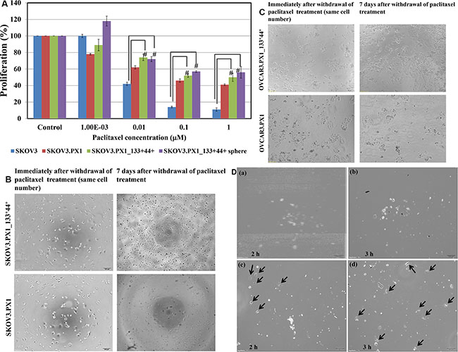 Figure 3: Chemoresistance and chemotaxis of SKOV3.PX1_133+44+ and OVCAR3.PX1_133+44+ cells. (A) Paclitaxel cytotoxicity among SKOV3, SKOV3.PX1, SKOV3.PX1_133+44+, and SKOV3.PX1_133+44+ sphere cells. Sphere cells exhibited superior survival after paclitaxel treatment at various concentrations (t-test, #p < 0.005). (B–C) SKOV3.PX1_133+44+ cells exhibited superior recovery after paclitaxel withdrawal. SKOV3.PX1_133+44+ cells exhibited better proliferation versus SKOV3.PX1 cells 7 days after paclitaxel withdrawal. Cells were photographed at 100× magnification. OVCAR3.PX1_133+44+ cells behaved similarly. (D) Chemotactic capability of SKOV3.PX1_133+44+ cells. A 100-μl aliquot of SKOV3.PX1 cells was added to the upper deck of each transwell, and conditioned media from SKOV3.PX1 or SKOV3.PX1_133+44+ cells was added to the lower decks. SKOV3.PX1 cells penetrated the transwell membranes and migrated to the lower decks after two hours (arrows: SKOV3.PX1 cells in lower decks panels a and b: SKOV3.PX1 conditioned medium at two and three hours; c and d: SKOV3.PX1_133+44+ conditioned medium at two and three hours). Cells were photographed at 100× magnification.
