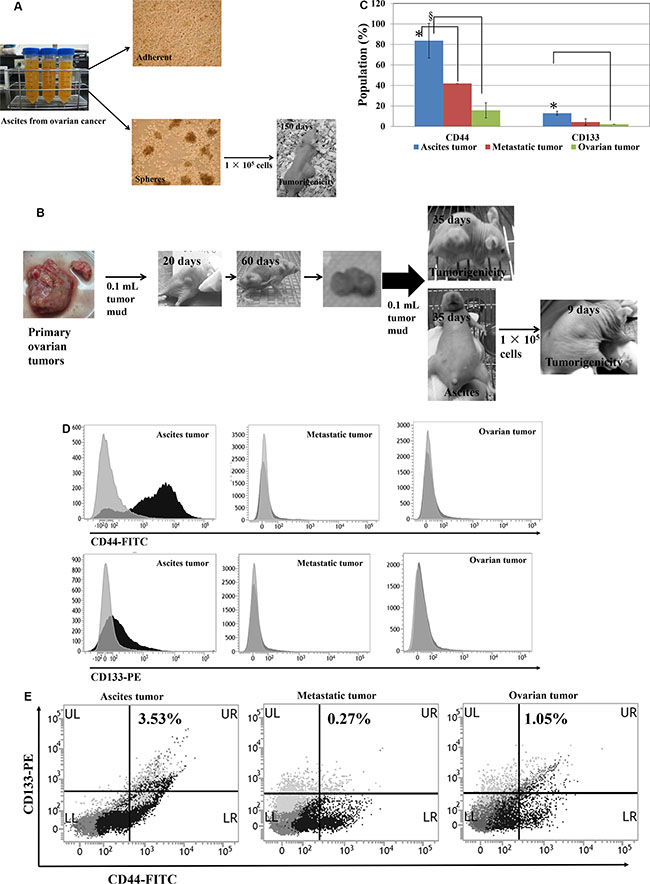Figure 5: CD133+/CD44+ subpopulations and tumorigenicity of human ovarian ascites cells and ovarian tumors. (A) Human primary ovarian ascites cells (HOVCA_AS) exhibit tumorigenicity. HOVCA_AS cells were grown from the ascites of a patient with primary ovarian epithelial cancer (images: 100× magnification) and formed spheres when cultured in ultra-low attachment culture dishes (Corning, Corning, NY, USA). Transplantation of 1 × 105 HOVCA_AS cells to the dorsa of nude female mice led to tumor formation. (B) Repeated in vivo transplantation enhanced the tumorigenicity of human primary ovarian tumors. (C–D) CD133+ and CD44+ expressions in clinical primary-ovarian-cancer specimens and normal ovarian cells. CD44 (FITC) and CD133 (PE) expression in primary-ovarian-cancer ascites cells (N = 5), metastatic tumors (N = 3), ovarian tumors (N = 5), and normal ovarian cells (N = 7) was determined using flow cytometry (BD Biosciences, San Jose, CA, USA; fluorescent markers: FITC and PE, respectively; t-test, *p < 0.05; §p < 0.0005). (E) Representative double CD44-FITC and CD133-PE staining of a clinical primary-ovarian-cancer specimen.