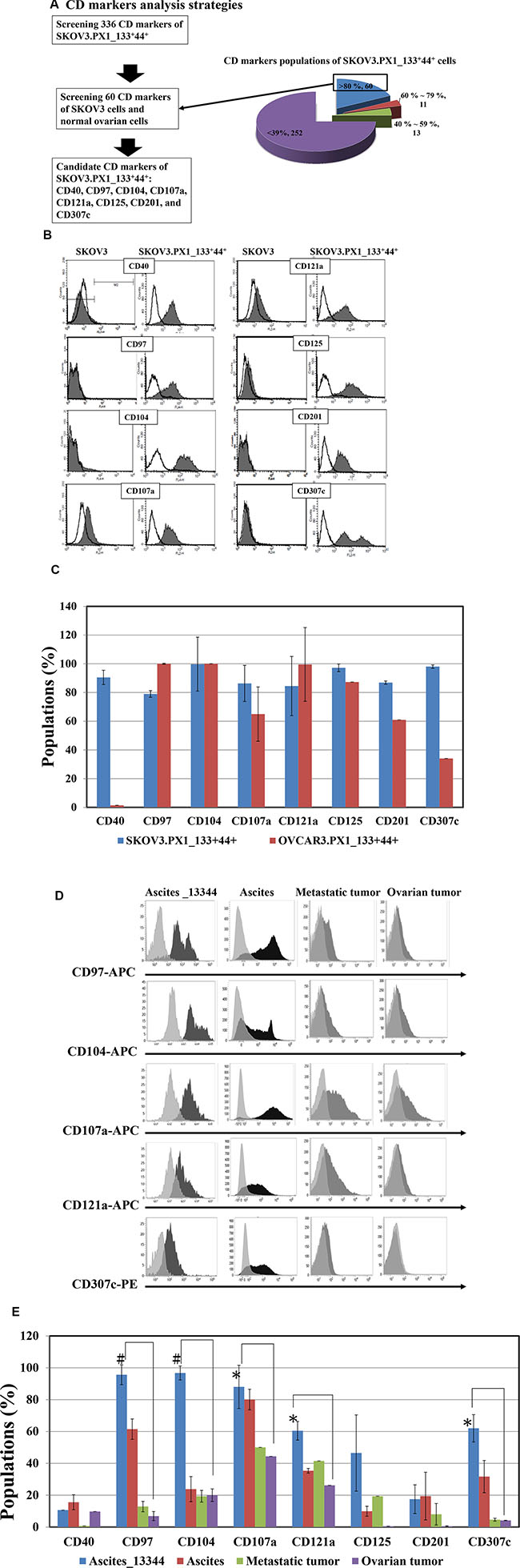 Figure 6: Candidate CD markers of ovarian SKOV3.PX1_133+44+ CSC-like cells. (A) CD marker analysis strategy. Surface marker expression in normal ovarian, SKOV3, and SKOV3.PX1_133+44+ cells was analyzed by flow cytometry. A total of 336 surface markers were evaluated in SKOV3.PX1_133+44+ cells; of these, 60 CD markers were strongly expressed (> 80%). Among these 60 markers, eight (CD40, CD97, CD104, CD107a, CD121a, CD125, CD201, and CD307c) exhibited differential strong expression in SKOV3.PX1_133+44+ cells versus parental SKOV3 and normal ovarian cells. (B) Fluorescently determined expression of these eight markers in SKOV3 and SKOV3.PX1_133+44+ cells. (C) Expression of these eight markers in OVCAR3.PX1_133+44+ and SKOV3.PX1_133+44+ cells. Marker expression was analyzed by flow cytometry. (D) Expression of the eight markers in clinical Ascites_133+44+ cells and primary-ovarian-cancer specimens. Fluorescence expression levels were determined by flow cytometry. (E) Populations of clinical primary-ovarian-cancer specimens and normal ovarian cells that expressed the eight markers, determined via flow cytometry with FITC- and PE-conjugated antibodies against CD44 and CD133, respectively; Ascites_133+44+ (N = 3), primary-ovarian-cancer ascites (N = 5), metastatic tumor (N = 3), ovarian tumor (N = 5), and normal ovarian cells (N = 7) were analyzed (t-test, *p < 0.05; #p < 0.005).