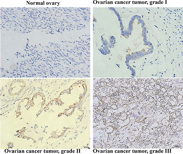 Figure 7: CD133 expression correlated with a high differentiation grade in human ovarian serous cystadenocarcinomas. Immunohistochemical analysis of CD133 expression in human ovarian serous cystadenocarcinoma tissues; 400× magnification.