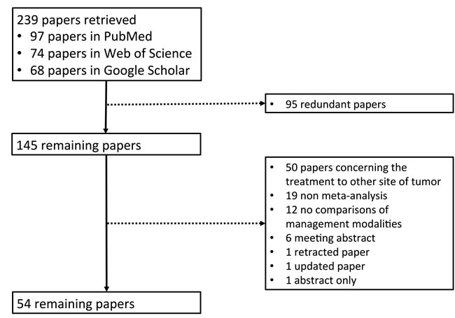 Overall, 239 papers were identified. Among them, 54 meta-analysis papers were finally included [7-60] (Figure 1). The characteristics of these included papers were shown in Supplementary Table S1. Their major findings were summarized according to the treatment modalities (Tables 1-18 and Supplementary Tables S2-S21).